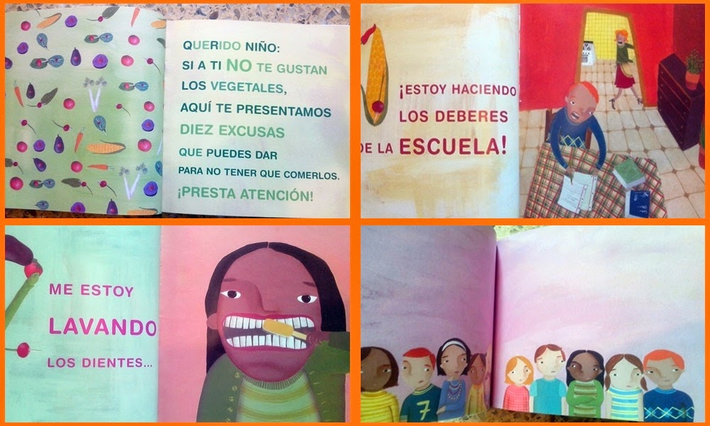 Las ilustraciones son muy coloridas, resaltan mucho los vegetales, como pueden ver en la página rosa de arriba. Las letras son grandes, lo que ayuda mucho a la lectura de los más pequeños. Por cierto, si bien el título es Diez excusas para no comer vegetales, vale aclarar que la intención de la autora es totalmente contraria a la premisa.