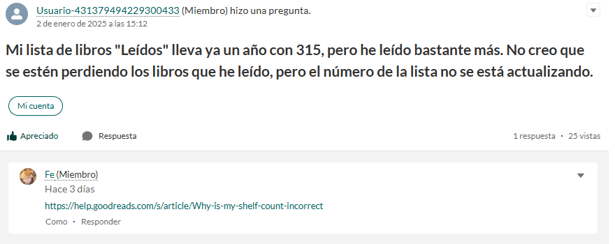 La pérdida de registros históricos, metas de lectura incompletas, son solo el comienzo. ¿Has revisado si todos tus libros están ahí? ¿Te darías cuenta de si no lo están? Hay un gran silencio sobre esto. Cuando te quejas con el área de Ayuda te piden que revises tu base de datos para identificar qué libros te faltan, te mandan a controlar fechas, pero no te dan una respuesta real. Son solo usuarios con buena voluntad, ellos no tienen idea. Y cuando te quejas con el área de Soporte no te responden o te responden con respuestas automáticas generales que no resuelven tu problema. Y afrentémoslo: no hay solución para esto. Cuando el registro se borra, se borra.